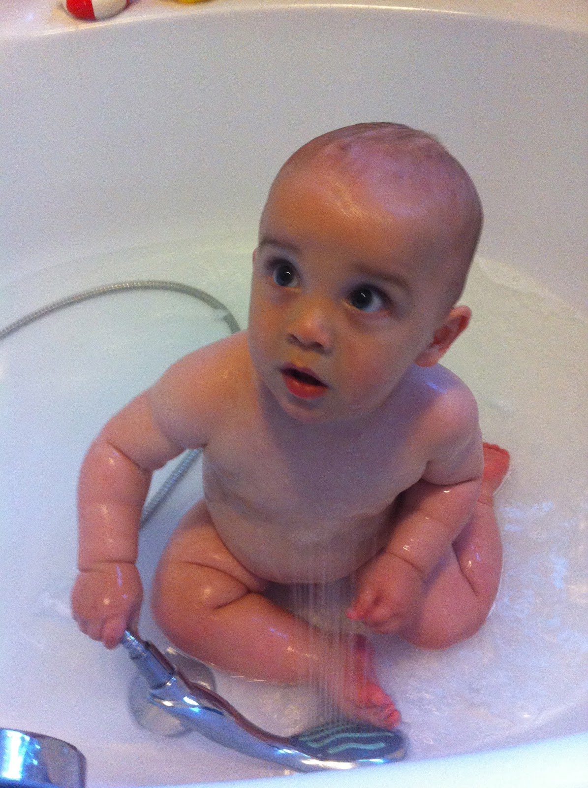 Alvás, evés…alias napirendetlenség: A hóelejei keverc után, úgy tűnik beállt az új rendszer, immár az ő rendszere. 7 körül kel, játékkal indul a nap 10ig bezárólag eszik kb. 190 gyümölcsöt. 10-től általában séta, játszótérrel-fagyizással fűszerezve (általában egyezik a fagyi-izlésünk) kb. 2 órában, amiből vagy alszik egy felet, vagy nem. Hazaérve még kis játék aztán ebéd 190 főzelékként. Utána még némi játék, aztán délután szunya, előtte újabban bevág egy kisebb adag tápszert. Ilyenkor alszik egy hosszabbat, aztán délután újra játék, esetleg még egy kör játszóteres séta. Uzsonnára joghurtot eszik. Vacsorára az ágyban tápszert. Betöltés vagy van, vagy nincs, már nem igazán betöltés, mert igény szerint megy:P Hajnali 4-6 között szokott kérni egy reggelit, megissza és simán visszaalszik…magától hasra fordul mikor elégnek érzi a kaját. Az utóbbi napokban annyiban változott a fenti tematika, hogy bevezettük a vacsora fogalmát, ami fürdés előtt egy főzeléket jelent, utána a tápszert cumizva alszik el. Éjjel újabban csak teázni kel fel…ha egyáltalán. Rengeteget iszik, legalábbis számomra a 3-4 dl folyadék (ízesítetlen édesköménytea, sima víz) elég soknak tűnik egy babához képest. És egyébként meg folyamatosan eszik…hol egy kis buláta, sajtos tallér, keksz van a kezében/szájában, hol némi eper (igen, eszik epret már, simán elvette és megette, azóta is nagyon szereti), alma, vagy valami egyéb, amit sikerül elcsennie. A főzelékeket ennek ellenére még mindig szigorúan pépesen kéri, ha nem krémesítek eléggé, simán kiköpi a kaját.